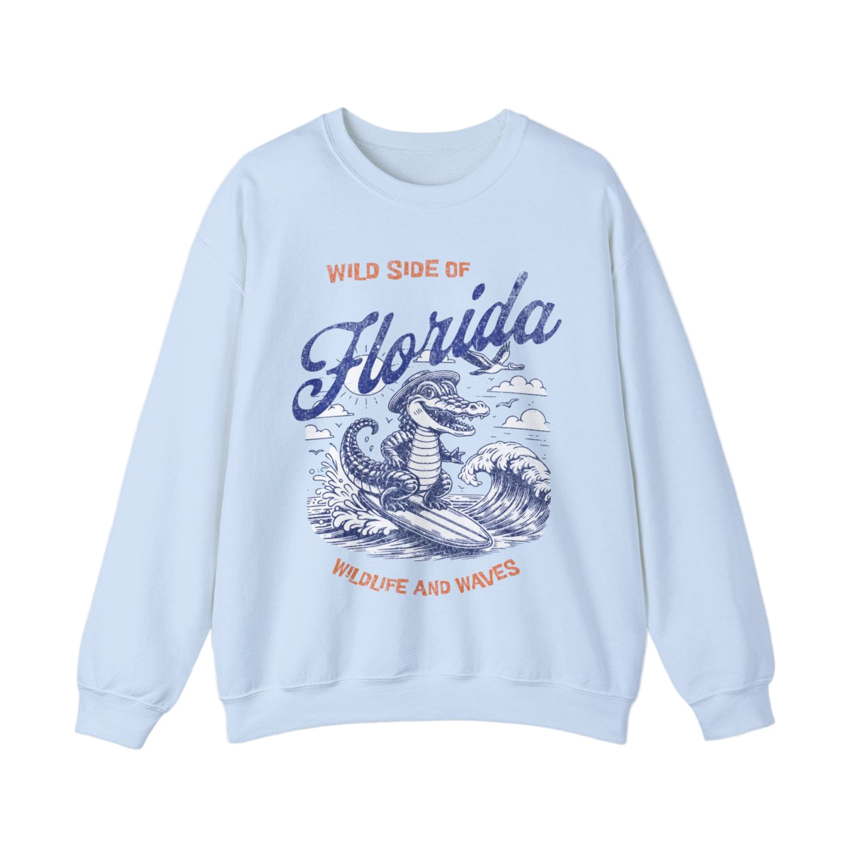 Embrace the adventurous spirit of Florida with our "Wild Side of Florida" sweatshirt. The front graphic showcases a playful alligator surfing on ocean waves**, with a stylish blend of vintage blue and orange hues. This sweatshirt is not only perfect for wildlife enthusiasts but also makes a statement in casual settings.